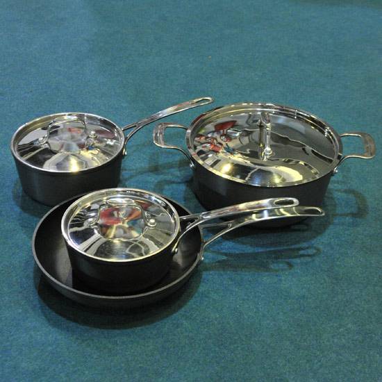 As shown is a cookware set including a saucepan, frying pan, grill pan and a glass lid. Made of fine aluminum, this cookware set is known for its durability and quality. The cookware set is best for gift for mothers.