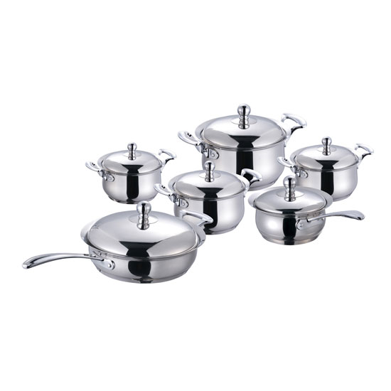 This is a 12-piece cookware set including four casseroles, a saucepan and a frying pan. Made of top-quality stainless steel, each piece comes with a high-glossy finish. The non-stick interior allows easy cleaning.