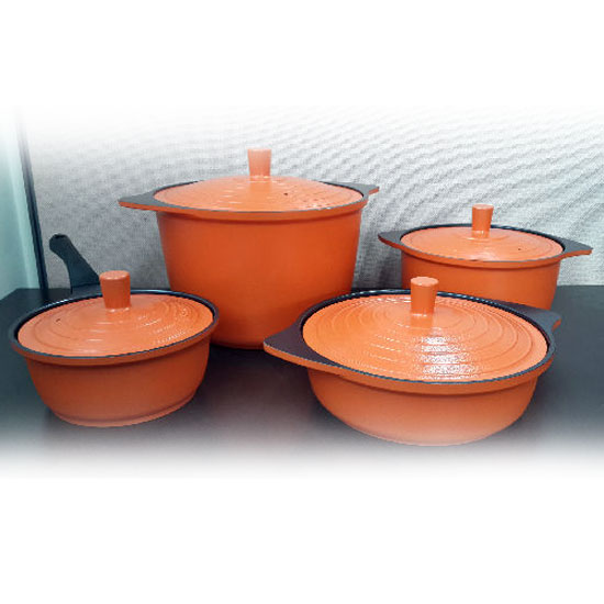This is an elegant cookware set with four casseroles in a two-toned color. Each piece is designed with handles for easy and safe carrying. This cookware set is easy to clean and offers long-lasting durability.