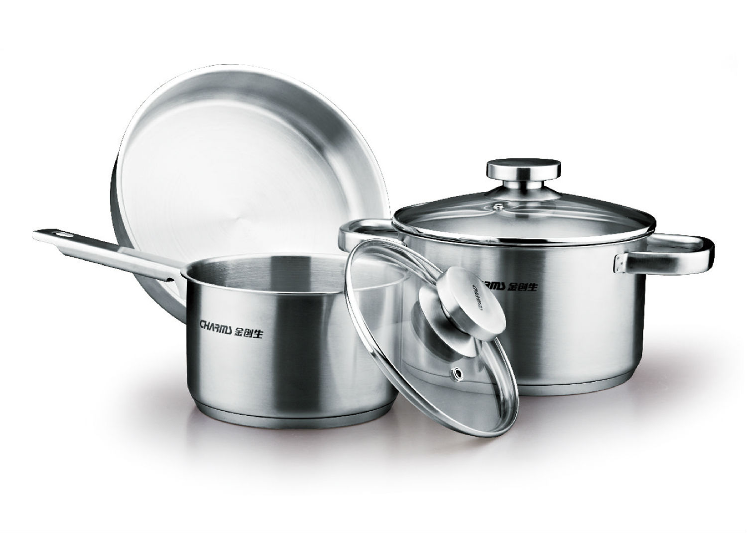 The highlighted cookware set includes a frying pan and two sauce pots with transparent lids. They are made of stainless steel and have handles on the side for ease of use. This charming and functional cookware set is suitable for preparing a wide variety of cuisines.