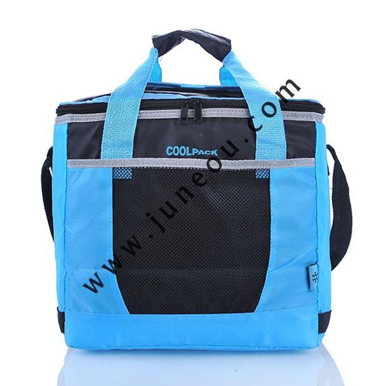 This is a cooler bag in black with bright blue accents. The high-quality PVC material promises a long service life. There are different designs available for you to choose from.