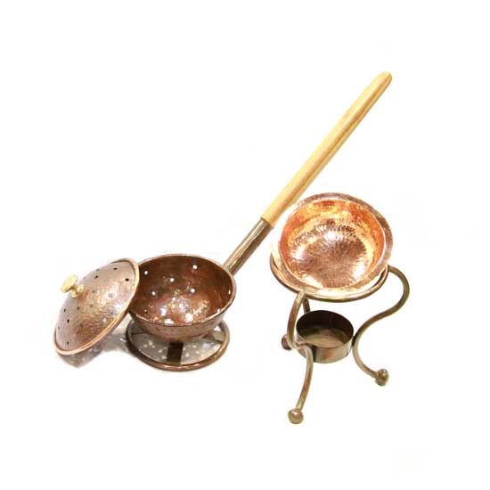 This round container is designed for java spas and aroma therapies. It is constructed from copper for durability. This practical container is finished with a handle for ease of use.