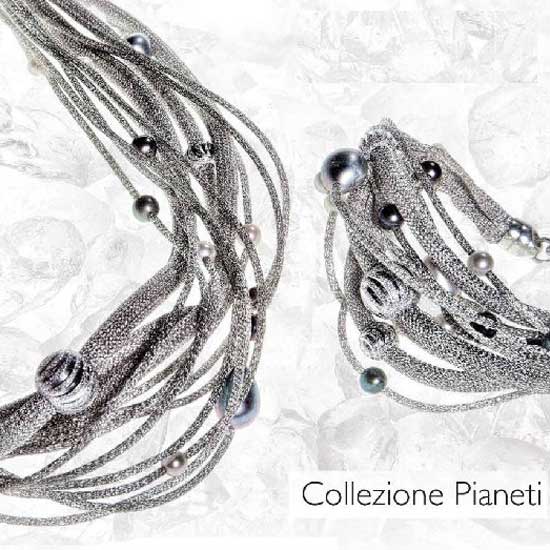 The Pianeti collection features necklace with a distinctive and trendy design. A silvered and enameled soft copper mesh is the base for a little galaxy enshrouding your neck and wrists. The planets are natural pearls, shiny sterling silver spheres, sterling silver element with cubic zirconia.