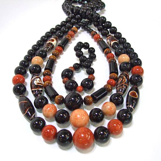 These are coral bead necklaces and bracelets in different lengths. They are threaded with round and cylindrical coral beads in assorted colours, such as black, orange, brown and red. The jewellery are perfect for matching clothing in ethnic style.