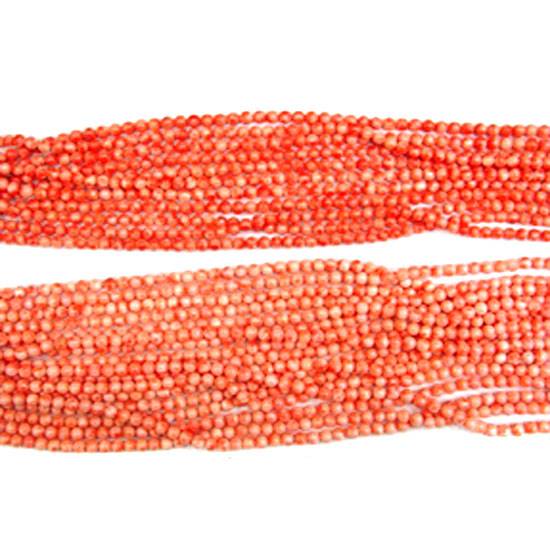 These are strings of coral beads in a mixed colour of red and white. The drilled beads have a full round shape in different sizes. The smooth and brushed surface allows the beads to be used for matching pearls and other precious stones.