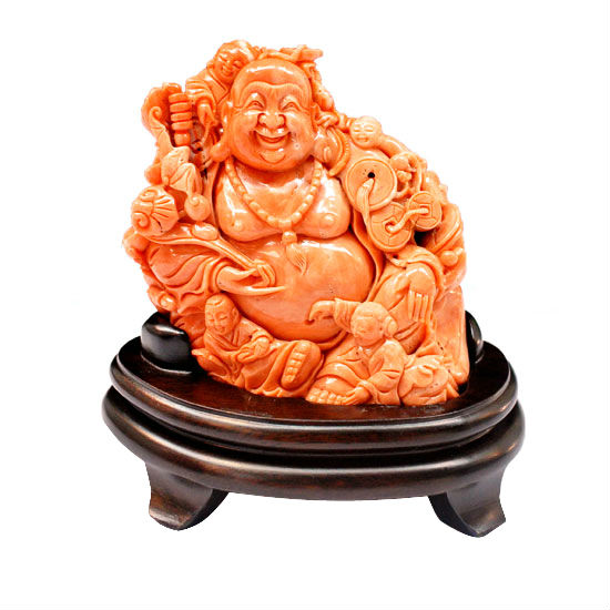 This Budai carving lifts your mood with his fleshy body and cheerful face. Accompanied by happy kids and copper coins around, the statue brings a joyful atmosphere to your place. The details of it are well-rendered in carefully incised lines throughout.