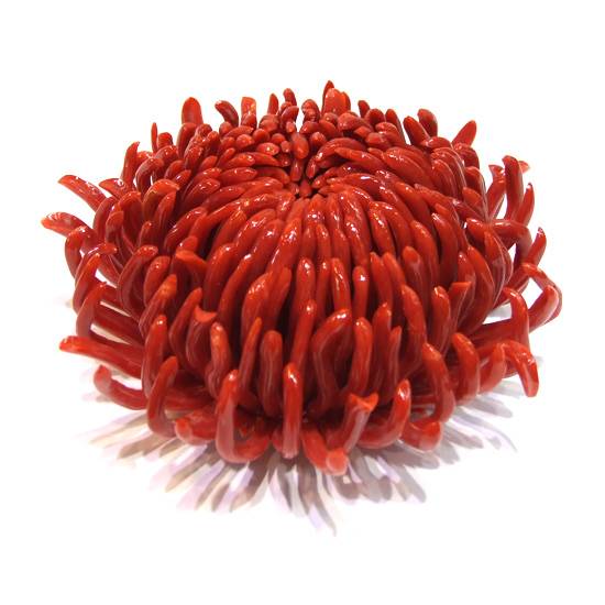 This is a coral carving with a chrysanthemum motif. The carving is made of high quality coral in its natural colour. This coral carving symbolizes good fortune.