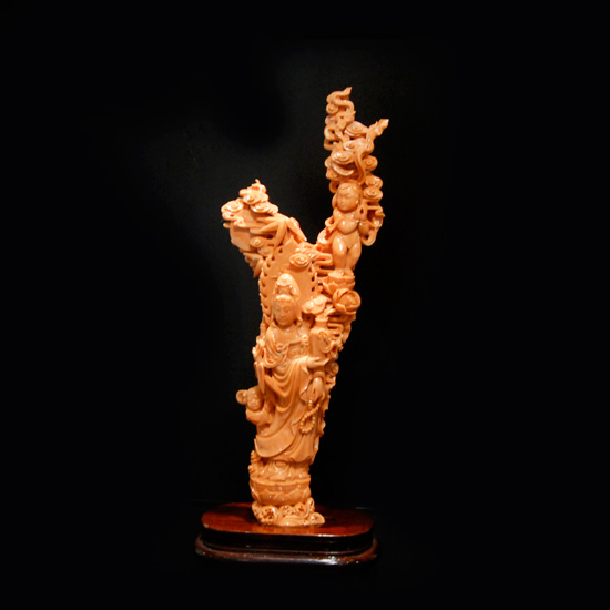 This exquisite coral decoration is carved with a Guanyin. The bottom of the piece features a rectangular brown base. The well-designed decoration adds a unique touch to your room decor.