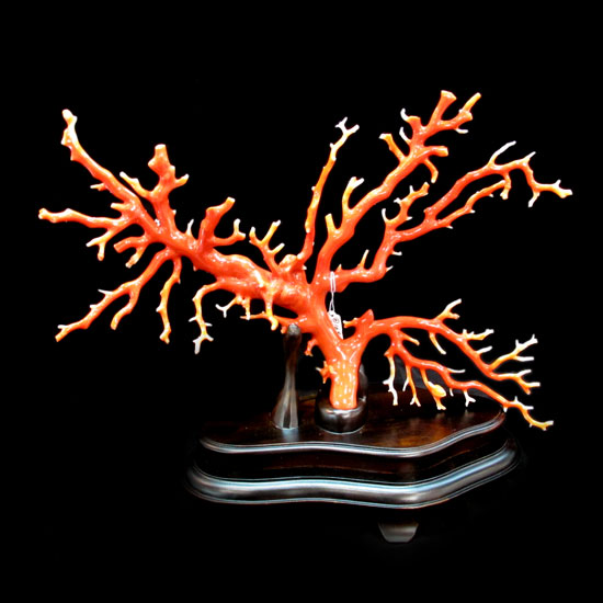 Featured is a coral decoration depicting a lively, strong tree of life. The piece is crafted with premium corallium elatius that gives a soft and warm peachy hue. The tree sits on a polished base for added glamor.