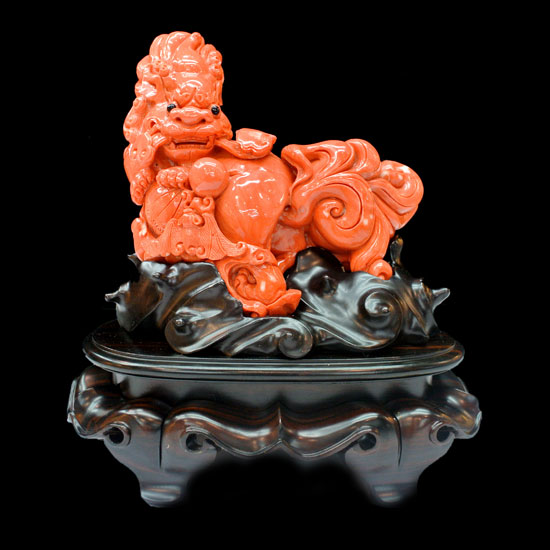 This is a piece of decorative carving made of pink coral. The carving showcases an adorable lion sitting on a black base for support with a delicate design. This artistic piece is great as a gift for the coral enthusiasts.