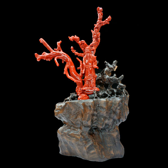 This is a piece of carved coral decoration in crimson color. This coral decoration features a lucky wealth blessing theme with a sold base for support. You can enhance your home decor with this stunning coral carving.