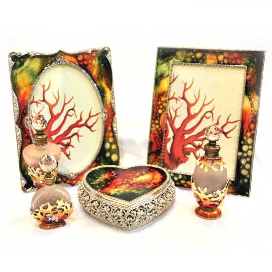 The coral decoration series comprises three perfume bottles, two picture frames and a jewelry box. The delightful designs offer distinction and individuality. These coral decorations make a wonderful house-warming gifts.