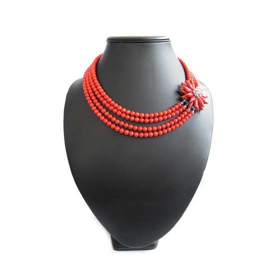 The displayed necklace comes with 4 rows of coral beads for a brilliant touch. The flower design with dazzling diamonds in the center highlights the whole look. This eye-catching necklace is an ideal gift for ladies.