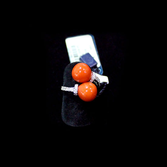 Displayed is a coral diamond ring coming in a high quality white gold setting. The coral are well polished to offer irresistible luster and shine. Adorn your slender finger with this coral diamond ring.