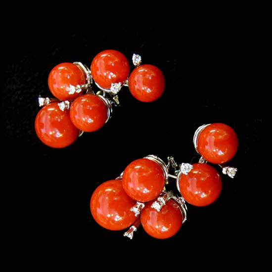 This is a pair of earrings with a grape-like appearance. Each piece features a white gold mounting with 5 glossy coral beads with natural luster. The small diamonds in between of the beads add for extra glamor to these stunning earrings.