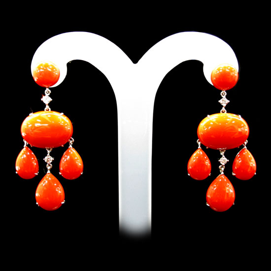Pictured is a pair of dangling earrings displaying the charming beauty of coral. The oval main piece and three teardrops suspended under a round coral bead on each side. This exquisite pair matches your evening oriental look well.