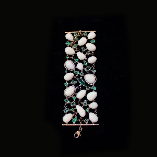 - Materials: rose gold, white coral, diamonds, emeralds.