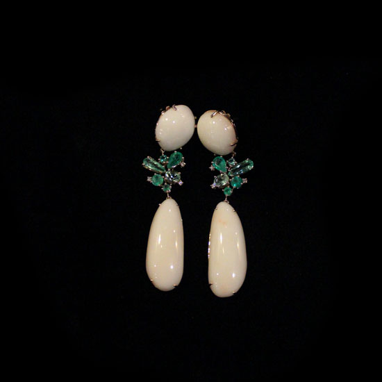 These earrings are made from top grade white coral, emeralds, diamonds and rose gold. The white coral is polished into an irregular shape for a unique touch. They are perfect for embellishing your overall outfit.