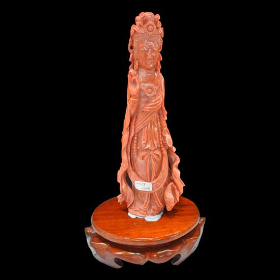 Featured here is a delicately carved coral Guanyin statue. The vivid design and the warm even color of the statue delights collectors tremendously. This exquisite coral decoration is also a work of fine craftsmanship.