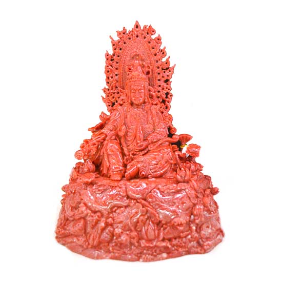 This coral Guanyin features a deep red surface. The delicately carved Guanyin shows a sitting posture. The decoration is suitable for different indoor settings.
