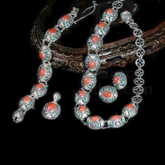 Displayed is a coral jewelry set that comes with a necklace, a bracelet and a pair of earrings. Crafted with intricate inlaid filigree techniques, this jewelry set is a good example of one of the eight Yanjing wonders. The jewelry set showcases a royal feel with a retro touch.