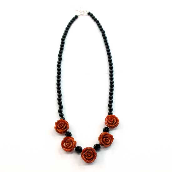 Update your look with the featured necklace. It is made up of faceted onyx beads. The necklace features five roses that are made of red coral. It makes a beautiful decoration for both grand and casual looks.