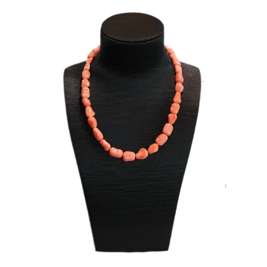 This featured necklace highlights a gorgeous arrangement of peachy Momo corals. The coral beads are designed in baroque shapes for a touch of extra style. Match this necklace with your summer outfit for a charming look.