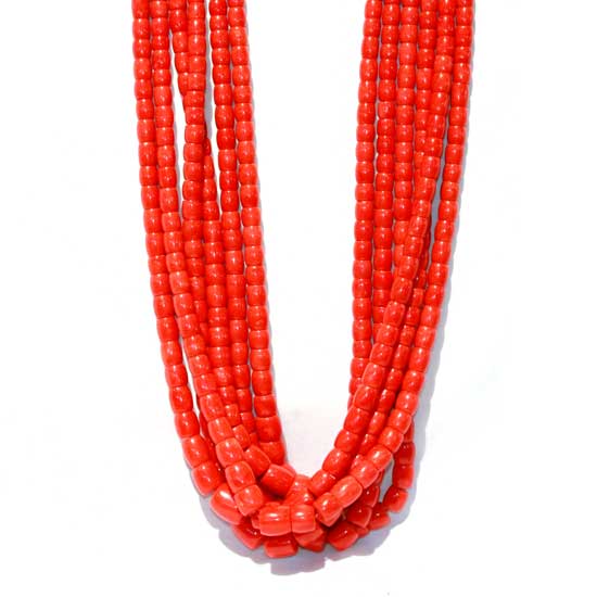 Showcased is a beautiful necklace featuring coral beads. The natural red coral is carved in barrel-shape beads and polished with a smooth touch. The breathtaking appearance of this necklace makes any outfits extra attractive.