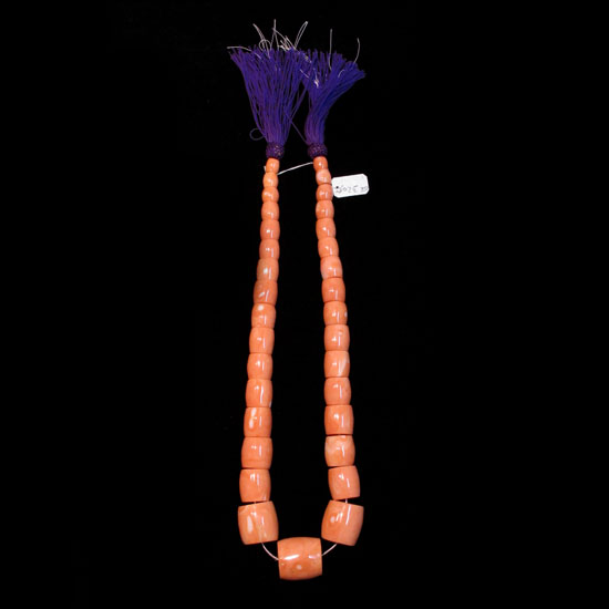 Featured here is a gorgeous necklace beaded with precious corals. The stylish necklace features natural coral beads linked up by thread, glistening with an orange glassy shine. The beautiful purple decorations are added for a touch of elegance.