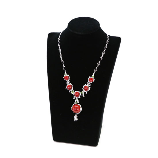 Extravagantly beautiful, this necklace features an oversized pendant with a domed coral. The necklace comes with five pearl-shaped coral stones. Each of the pure, well-polished coral stones is encircled by diamond accents, brilliant and gorgeous.
