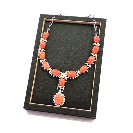 This necklace is formed by multiple pure, well-polished coral cabochons. The diamond accents between each coral cabochon are carefully crafted for an extra dose of elegance. With its matchless beauty, this chunky, exaggerated coral necklace will impress both ladies and gentlemen.