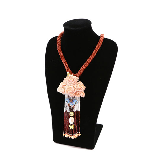 This necklace is formed by a bold, fancy coral bead necklace, a pinkish, oversized coral pendant and beaded tassels. The floral-shaped pendant is exquisitely crafted for a refined look. This necklace flaunts a traditional touch and will look perfect with cheongsams.