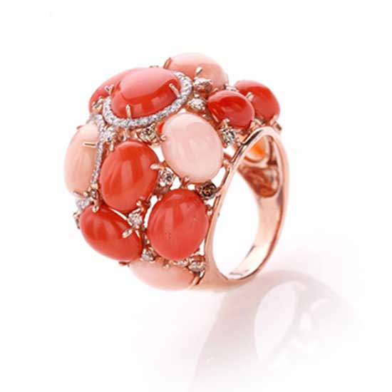 The displayed 18K gold ring is characterized by its luminous oval-shaped coral stones in tomato red and baby pink. The dazzling diamonds jazz up the appearance with an elegant and chic touch. This gorgeous coral diamond ring makes an ideal gift for your loved one on wedding anniversaries.