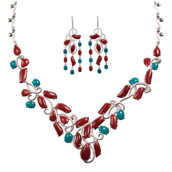 Looking at this necklace and earing set, can you feel the elegant shine interact between reddish coral and blue chalcedony. Like living in garden, rose 18K gold line in Europe flower-end, small diamonds accentuate and abundant the whole set. Dangling design earrings perfect match with pulled up hair, definitively made you win the lady of party.