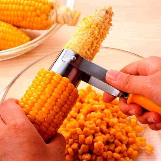 Displayed is a corn stripper which makes corn stripping ultra convenient. It comes with an ergonomic handle for comfortable operation. The circular blade is equipped with saw teeth to speed up stripping.
