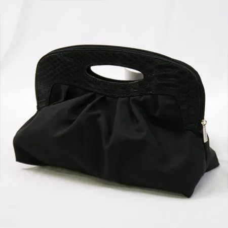 Provide organized storage for your toiletries, makeup and other everyday essentials with this black polyester cosmetic bag. It has a zippered compartment for storage and has cutout handles on top for comfortable carrying. This cosmetic bag is adorned with crocodile skin patterns for a fashionable look and can also be used as a sunglass case or an evening bag.