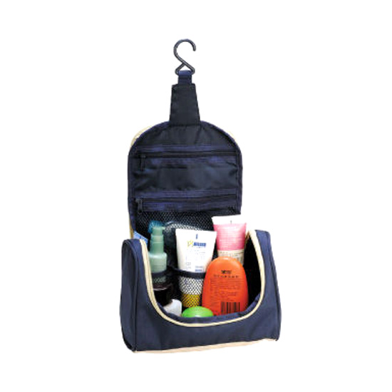 This is a cosmetic bag in deep blue with a zip enclosure and a hanging hook. It comes with assorted compartments inside for keeping your groceries in order. Made of robust fabric, this bag promises durability.