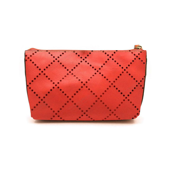 This is a cosmetic bag with checked patterns in red. It is made of quality PVC for extended durability. It is a perfect storage bag for your cosmetics and make up tools on the go.