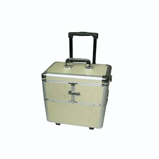 This rectangular cosmetic case contains multiple compartments to maximize space for storing a wide range of cosmetics and tools. It is made of lightweight and durable materials to ensure high durability. It is equipped with wheels to offer great convenience for long-distance carrying. This simple yet stylish cosmetic case is an ideal choice for professional make-up artists.