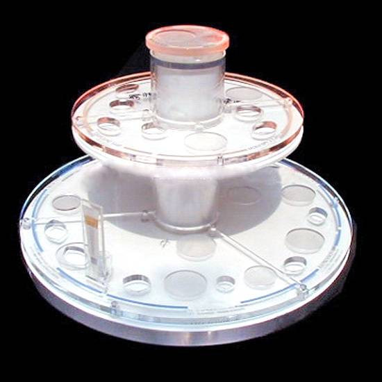 This is a two-layered cosmetic display stand. The upper layer is clear pink and the lower one is clear blue. There are holes of different sizes and shapes fitting various kinds of cosmetics.