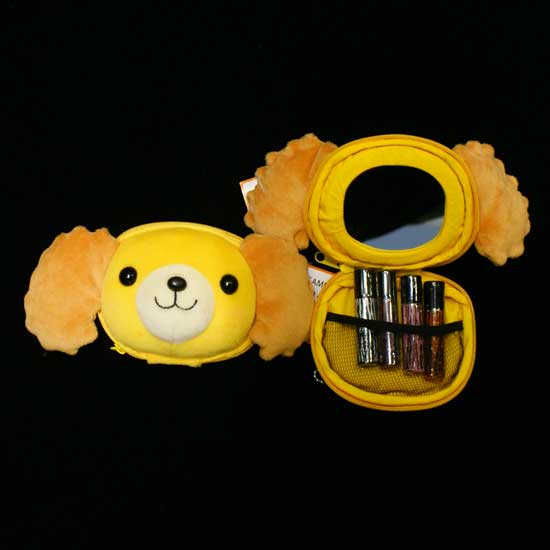 This cosmetic kit comes in a unique dog shape in bright yellow. It features a mirror, a brush and tubes of lip gloss and mascara. The cosmetic kit is a great gift for kids and young adults who like to dress up.