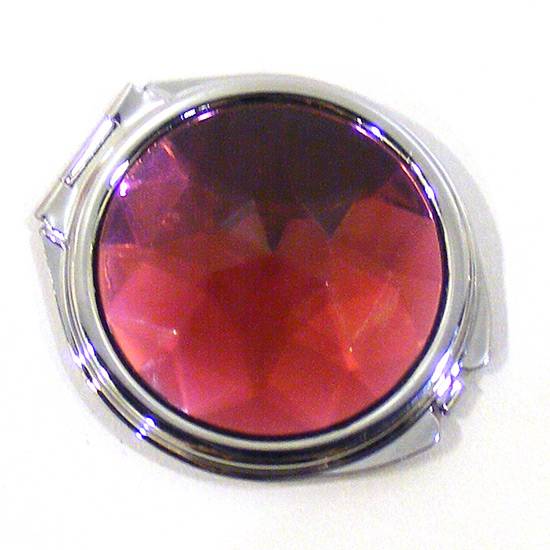 The item shown on the picture is a cosmetic mirror featuring a round and red acrylic stone with faceted surface on the cover. It is a fashionable and elegant accessory for every girl and lady for going out.