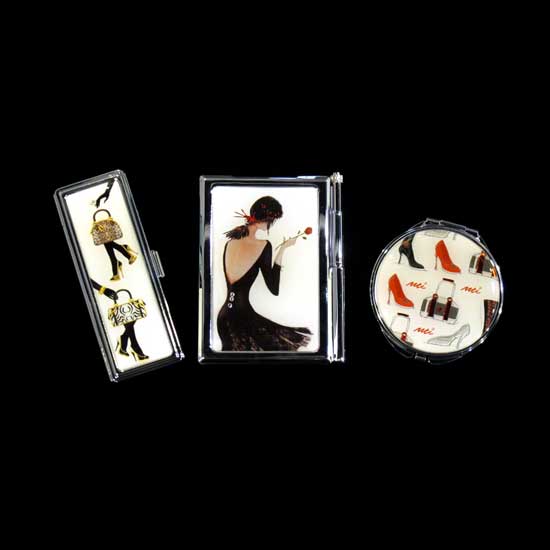 This is an eye-catching cosmetic set that is designed for ladies. This cosmetic set includes a mirror, a note pad with a pen and a lipstick case. The delicate prints are added for extra style.