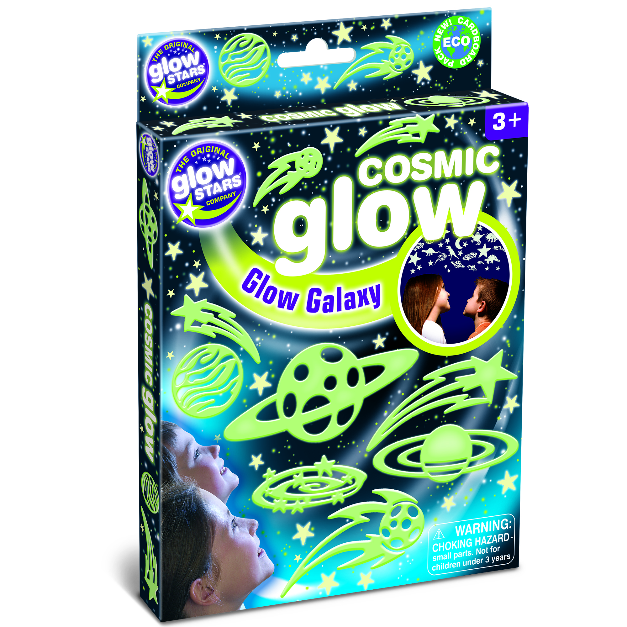 he Original Glowstars Company high-quality, plastic, glow-in-the-dark Galaxy shapes. Create a magical view of outer space on ceilings and walls using the self adhesive pads and at night-time, when the lights go out, they produce a fantastic glowing display. They can also be used to accessorise school books, bags and furniture. A perfect, fun yet educational, gift for kids who are interested in the night sky.