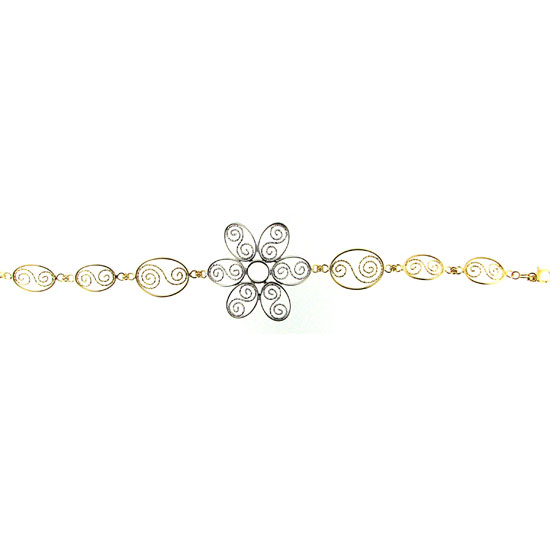 This pretty bracelet features an intricate filigree design rendered in silver and golden toned wires. The bracelet exhibits a polished finish with long lasting shine. Enhance the beauty of your hands with this elegant bracelet.