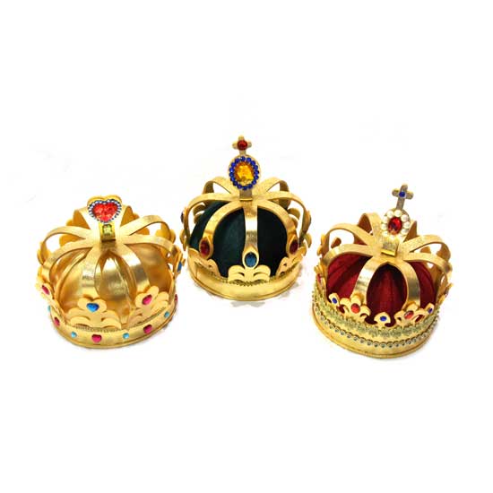 Displayed is a costume crown for kids that comes in three different colors. Designed in a golden color with colorful stone embellishment, this crown is shiny with a touch of grandeur. This costume crown is a fun choice for parties.
