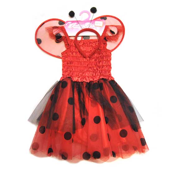 This is a girls' costume dress with an adorable insect design. It is designed in red with black dots and decorated with a pair of wings on the back. The head band with two cute antennae makes kids' costume outfit look lovelier and funnier.