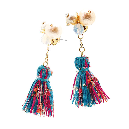 This is a pair of costume earrings that is finely crafted with refined details. They are well ornamented with colorful yarn details and shiny beads. This pair of earrings will add subtle glamor to your outfit.
