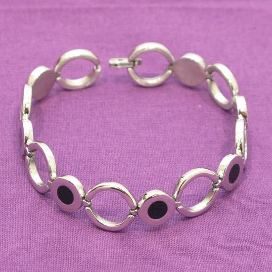 This is a stainless steel bracelet decorated with enamel features. The chain is formed by circles with an enamel centre connected with loops, which produces a stylish and easy-to-match look suitable for wearing every day.