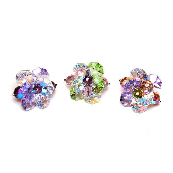 These rings present an extremely colourful image. The rings are designed in a flower pattern, with the petals fully covered with different colours, from green, blue, purple to orange. The petals are formed by several stones, which are faceted, meaning that their surfaces allow the maximal amount of lights to be reflected, and, thus, create a sparkling image.